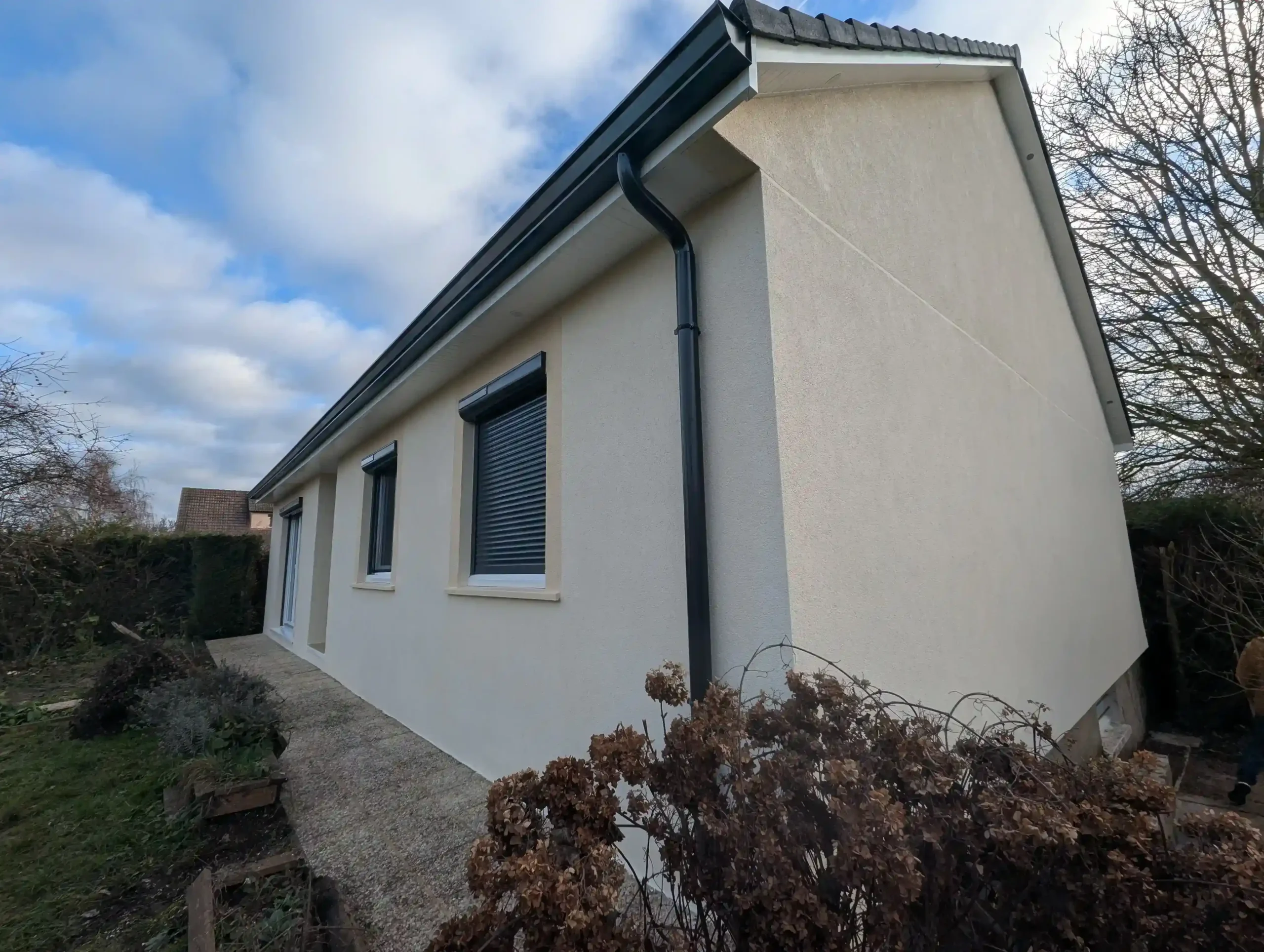 La rénovation globale de cette maison individuelle à Denonville (28) combine l’application d’un hydrofuge coloré sur toiture béton, le remplacement des zingueries par de l’aluminium laqué et une Isolation Thermique par l’Extérieur (ITE) sur pignons. Cette intervention traite la porosité des supports, modernise l’esthétique et supprime les ponts thermiques structurels.