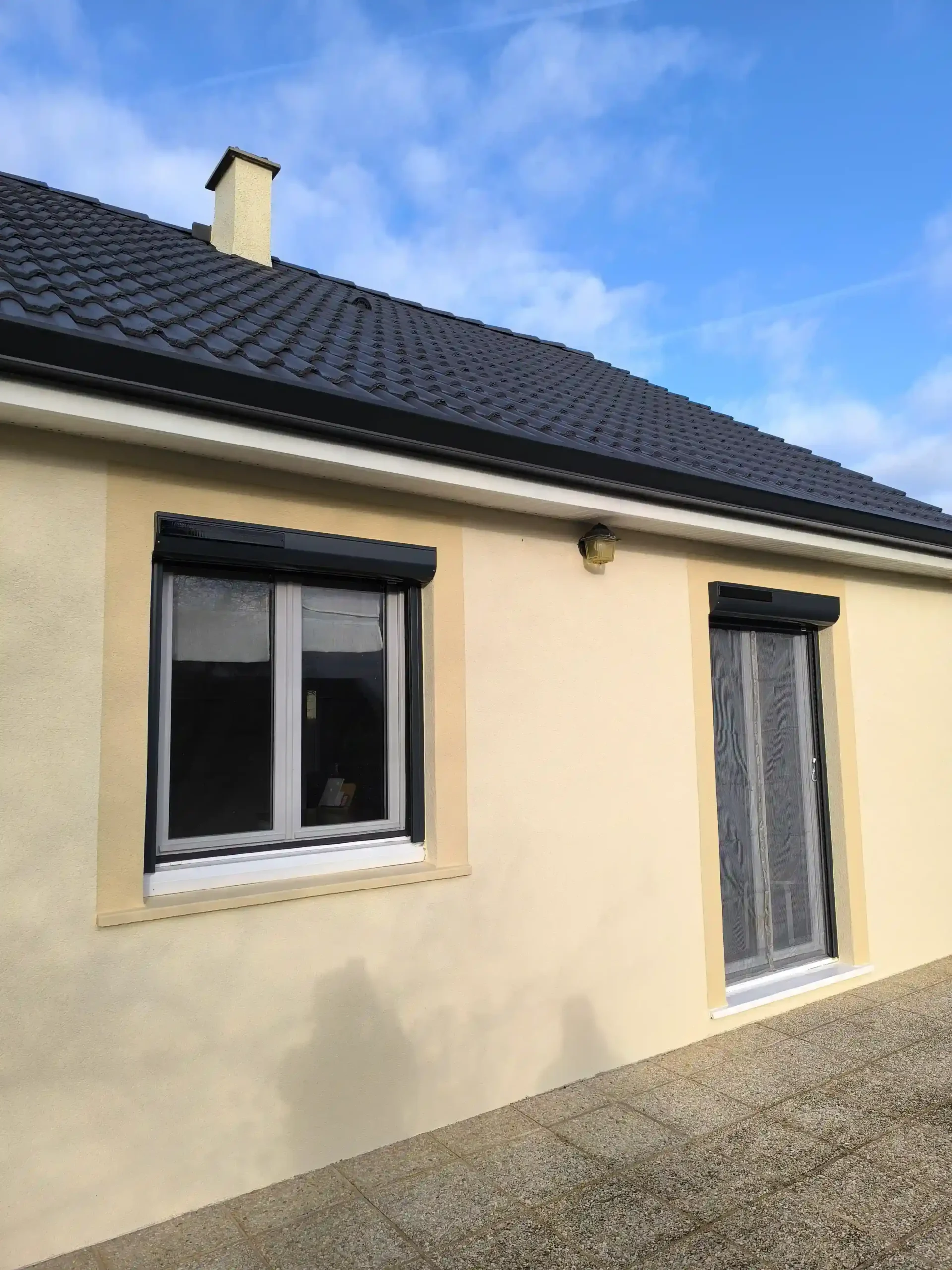 Les éléments en PVC ont été déposés. Les dessous de toit ont été réparés puis habillés en aluminium laqué, éliminant les corvées de peinture futures. Les gouttières ont été remplacées par des profilés aluminium Gris Ardoise (G300 ou G380 selon surface), assurant une durabilité supérieure et une esthétique contemporaine (« Look » moderne).